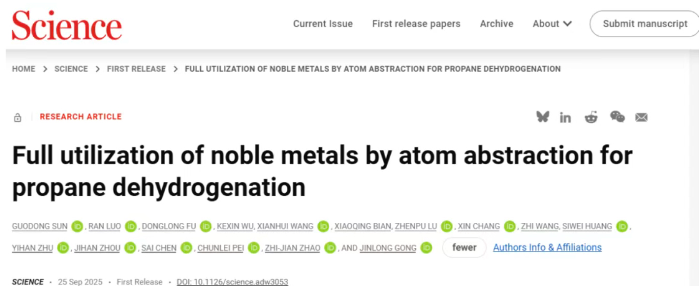XinChang, Zhi Wang, Siwei Huang, Yihan Zhu, Jihan Zhou, Sai Chen, Chunlei Pei, Zhi-Jian Zhao, Jinlong Gong*,Full utilization of noble metals by atom abstraction for propane dehydrogenation, Science, https://www.science.org/doi/10.1126/science.adw3053#core-collateral-purchase-access
