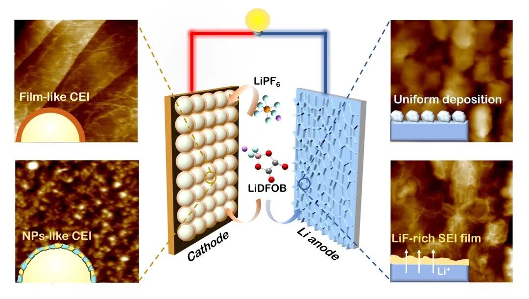 1. 利用原位EC-AFM技术,实时捕捉到由LiDFOB介导的薄膜型CEI和LiPF6诱导的纳米颗粒型CEI协同构建的双层界面结构;